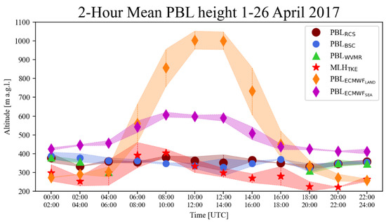 Mean PBL height calculated every 2 h from WCT on RCS (brown circles), BSC (blue circles), WVMR (green circles), TM on TKEdr (red stars) and ECMWF land bin (orange diamonds) and sea bin (purple diamonds) as described in Figure 8 and Figure 12. Standard deviations are displayed with the same color shading for each product.
