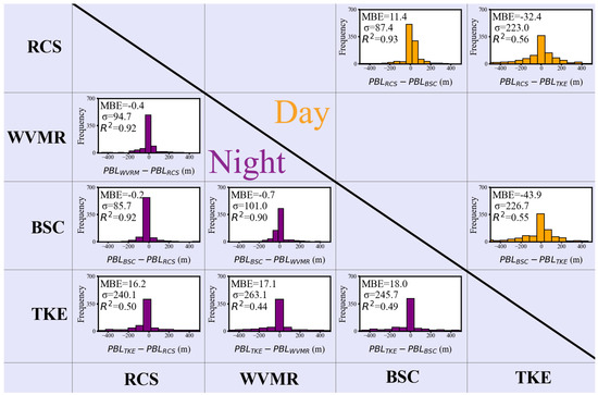 In addition to this, the differences of PBLWVMR-PBLRCS (σ = 94.7), PBLBSC-PBLRCS (σ = 85.7), PBLBSC-PBLWVMR (σ = 101) during nighttime and from PBLBSC-PBLRCS (σ = 87.4) during daytime, are described by smaller standard deviation.