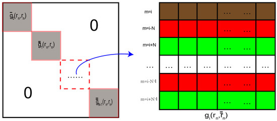 The layout of the matrix element of g-matrix. It is rearranged as a block diagonal matrix with N blocks referring to the structure of the U matrix. Different colors correspond to different azimuth mode “m”, brown indicates m = i, red and green indicate increase and decrease on this basis respectively.