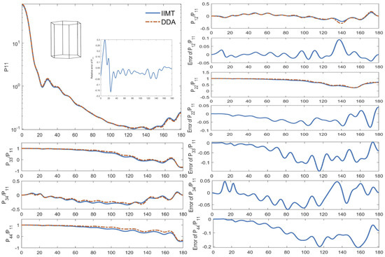 In the comparison of hexagonal prism particles, the wavelength of incident light was set as = 500 nm, the refractive index of the particles was taken as m = 1.33 + 0.0008 i, the bottom side length was set as a = 1.0 um and the height was set to be L = 2.0 um. The scattering phase matrix of the randomly oriented particles was simulated by IIM T-matrix and DDA methods, as illustrated in Figure 6. In the DDA model calculation, 2548 directions were selected to obtain the random-orientation averaged results.