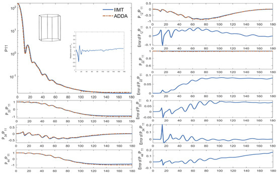 In the comparison of the twelve prism particles, the wavelength of incident light was set as = 1000 nm, the refractive index of the particles was taken as m = 1.33 + 0.0008 i, the bottom side length was set as a = 0.5 um and the height was L = 2.0 um. The scattering phase matrix of the randomly oriented particles was simulated using IIM T-matrix and DDA methods, as illustrated in Figure 9. In DDA model calculation, 1960 orientation directions were selected to obtain the average results.