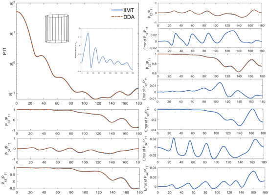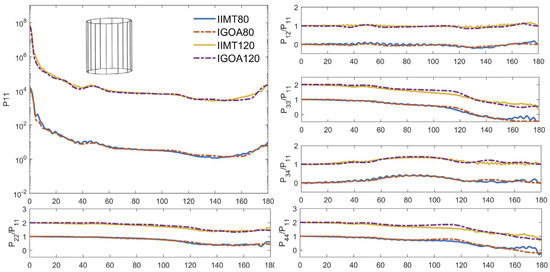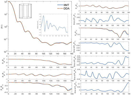In the comparison of octagonal prism particles, the wavelength of incident light was set as = 1000 nm, the refractive index of the particles was taken as m = 1.33 + 0.0008 i, the bottom side length as set as a = 1.0 um and the height was set as L = 2.0 um. The scattering phase matrix of the randomly oriented particles was simulated using the IIM T-matrix method and DDA model, as illustrated in Figure 8. In DDA model calculation, 1690 orientation directions were selected to obtain the average results.