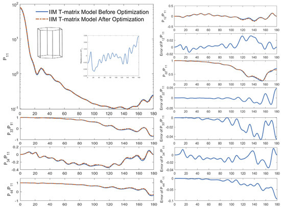 The differences in the calculation results of the T-matrix model before and after optimization were also compared. In this comparison, the particles used for model validation were hexagonal prism particles. The wavelength of incident light was set as = 500 nm, the refractive index of the particles was taken as m = 1.33 + 0.0008 i, the bottom side length was set as a = 1.0 um and the height was set to be L = 2.0 um. The scattering phase matrix of the randomly oriented particles was simulated by implementing IIM T-matrix methods before and after optimization, as illustrated in Figure 10, and the integral scattering parameters are presented in Table 5.