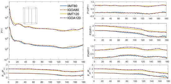 In the comparison of hexagonal prism particles, the refractive index of the particles was taken as m = 1.3078 + 1.66 × 10−8 i, the size parameters were, respectively, set at 80 and 120 , and the ratio of the maximum distance between any two points on the base to the height of the prism was 1:1. (as illustrated in Figure 11). The halos emerged when the size parameter was 80, when the size parameter was 120, and the ice halo peaks become sharp. This proves that the IIM T-matrix model can well reflect the diffraction properties of large hexagonal prism particles. For P12/P11, P33/P11, P22/P11, P44/P11 and P34/P11, good agreement was also achieved between the results of the IIM T-matrix method and IGOA. The P12/P11 curves were basically coincident, but when the scattering angle was 60°~120°, for P33/P11 and P34/P11 curves, the calculation result of the IIM T-matrix model was slightly lower than that of IGOA.