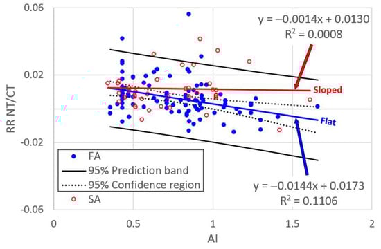 For FA, Figure 1 shows the data together with the regression line, the prediction band (black lines) and the confidence interval (dotted lines) on its mean for a given AI value. Figure 1 clearly shows that there is a linear trend, although variability around the line occurs, and that the 3 observations that are outside the [−1.96, 1.96] interval (the value of the 97.5 percentile point of the standard normal distribution) are outside the second confidence interval as well. An analysis of variance was not performed for the sloping areas, since the regression line is almost horizontal (very low angular coefficient −0.0014, F = 0.033).