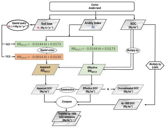 The methodological framework is summarized in the flowchart of Figure 2 where input and output data flow are reported. For the apparent RRNT/CT determination, a spatial query according to an erosion threshold (discussed later) made it possible to identify FA and SA areas where Equation (2) or Equation (3) were applied, respectively. The apparent and the effective SOC sequestration (Mg ha−1) were calculated by multiplying the RRs maps for the SOC map obtained by Lugato et al. [] and compared to 4p1000 SOC (Mg ha−1).