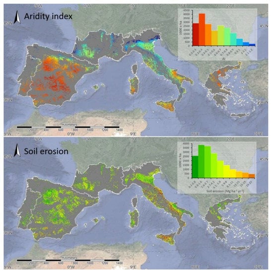 Distribution of Aridity Index within the study area (https://sites.ualberta.ca/~ahamann/data/climateeu.html, accessed on 1 September 2020) and soil erosion (Mg ha−1 yr−1) (Panagos et al. [], (https://doi.org/10.1016/j.landusepol.2011.07.003, accessed on 1 September 2020).