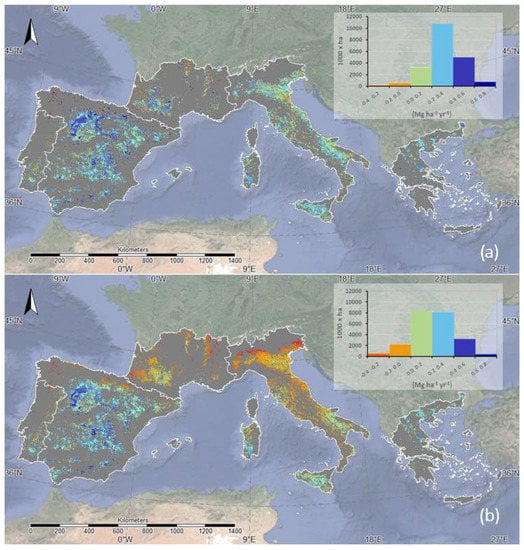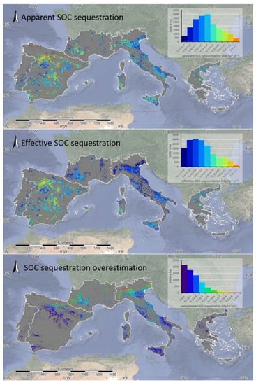The spatial approach proposed in this study made it possible to determine a value of 0.6 Mg ha−1 yr−1 (on average for all of Spain) in between the range 0.43 and 0.72 Mg ha−1 yr−1. Furthermore, 0.41 Mg ha−1 yr−1 and 0.34 Mg ha−1 yr−1 were estimated using data retrieved from Moreno-Garcia et al. [], for apparent and effective SOC sequestration, respectively, by also applying the approach developed in this study.