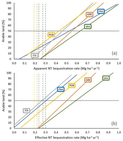 For Spain, Portugal, Italy and Greece, the average sequestration rates under NT, showed in the ECAF report, were higher than those estimated in this study, both in the case of apparent and effective rates (0.54 and 0.43 Mg ha−1 yr−1, respectively). A mere 0.20 Mg ha−1 yr−1 is reported for France, but this rate probably comes from Atlantic trials and is not appropriate for Mediterranean areas. In Spain, where several studies have been carried out in different areas, Gonzales-Sanchez et al. [] found an average SOC sequestration by NT equal to 0.72 Mg ha−1 yr−1 but observed a large variability between 0.09 and 2.01 Mg ha−1 yr−1 in relation to climate. Furthermore, by upscaling the same data to study the effect of NT applications on SOC, Moreno-García et al. [] found an average SOC sequestration of 0.43 Mg ha−1 yr−1 and an almost similar variability.