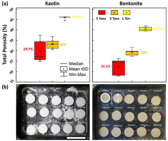 (a) Box plot of porosity distribution for kaolin (left) and bentonite (right) samples after compaction; (b) photographs showing the samples placed on a tray, ready for oven-heating.