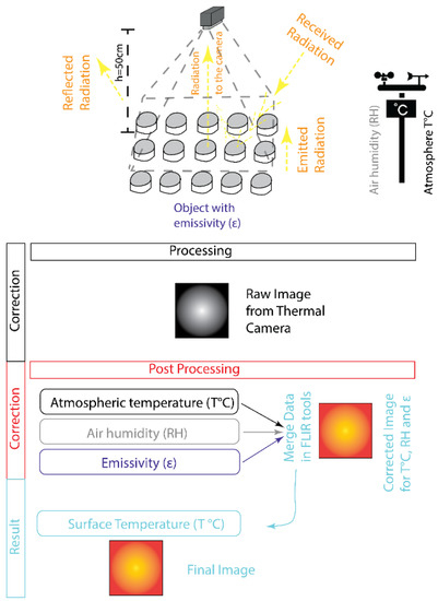 Thermograms were acquired via a FLIR C2 camera, placed perpendicularly to the tray, at 5 min intervals (absolute error < 1 s) for 80 min (Table S3). Thus, seventeen thermal images were taken of each tray, and all pixels of each imaged disk were considered in the subsequent analysis. Air humidity and temperature were recorded through a weather station (Figure 2; Tables S4–S7) to calibrate the thermograms during image post-processing. Emissivity was assumed according to the literature data [39]. We filtered the raw input following two main operations: a radiometric correction and a geometric correction. The first is computed according to the atmospheric temperature and humidity [15,25], whereas the second is given by georeferencing the images [8,15]. The latter step, commonly used for images of distant objects, was skipped as the sample-object distance was only 0.5 m.
