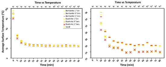 The thermograms captured the cooling phase over a duration of 80 min (Figure 3). By observing the sample image displayed in Figure 4, it is apparent that zones located at the boundary are cooling more rapidly, while the samples placed at the centre of the tray remain warmer for a longer time. Moreover, cooling is shown to proceed more rapidly near the edges of each sample compared to their core, as reasonably expected. This spatial variability in temperature during cooling is not an issue, as comparisons across materials were made for the same geometrical setup. Notably, the use of a circular shape (axial symmetry of the disks) is beneficial in that it makes cooling more spatially homogeneous as it minimises edge effects, as opposed to a prismatic shape [41,42]. A spherical shape suspended at mid-air in a well-ventilated room would be even more advantageous, but it would not be easily implementable in practice. In addition to the shape, also the surface roughness and colour of the material can affect the cooling behaviour. As for the latter, the darker colour of the bentonite as opposed to the white kaolin samples makes the former resemble a black body more closely.