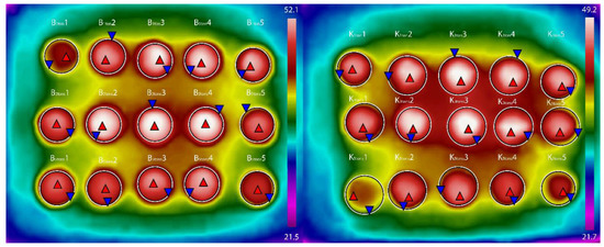 Examples of thermograms recorded during the cooling phase of bentonite (left) and kaolin (right) samples, in which is possible to observe the inhomogeneous cooling of the disks, where samples located at the centre (red triangles) show higher temperatures than those at the borders (blue triangles).