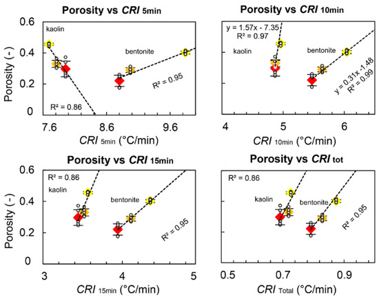Linear regression analysis between porosity and CRI according to different durations since the beginning of cooling: 5 min (top left); 10 min (top right); 15 min (bottom left); entire cooling phase (bottom right). Values for kaolin plot in th left portion of each graph (lower CRI), while those for bentonite plot in the right portion (higher CRI). The diamonds represent the mean values for disks, while small circles represent the distribution of values of all disks. Colours yellow, orange, and red, represent, respectively, samples compacted under 1 ton, 3 tons, and 5 tons.