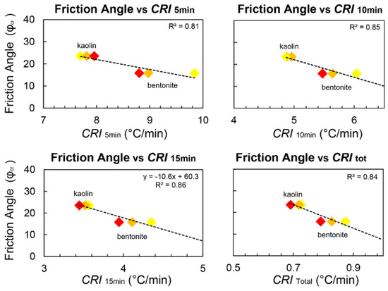 To obtain a quantitative insight, we then plotted the mean values of temperature, porosity, and critical state friction angle for each sample and performed a regression analysis (Figure 5 and Figure 6). In addition to evaluating distinct ranges of CRI values for the two clays, we find very good correlations between the porosity and CRI (Figure 5) and observe that the slopes of the correlations also are distinct. The coefficient of determination R2 is high for any time interval, but it is maximum for a cooling rate index (CRI = ΔT/Δt, where T is temperature and t is time) evaluated over the first 10 min of cooling (R2 = 0.97 for kaolin and 0.99 for bentonite). Interestingly, the correlation for the kaolin is negative during the first 5 min, then it turns positive, and the slope of the regression decreases as the time range increases. For the bentonite, the opposite holds true: the slope of the regression line increases for CRIs evaluated over longer time intervals. This observation seems worthy of further investigation as one could extract information on the nature of the material not only from the CRI value and the slope of the regression line, but also from how the latter changes with time during cooling. This value, in fact, is independent of the overall porosity and should only be influenced by some characteristics of the material itself (e.g., its mineralogy, pore size distribution, specific surface area) that could affect the cooling rate over time and/or as a function of the temperature difference between the material and the surrounding air or the air in the pores.