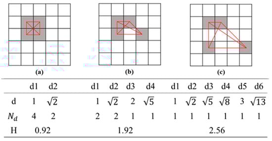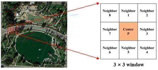 - The complexity of the neighborhood topology relationship is measured by the neighborhood pixel differences. For a certain pixel, the more that adjacent pixels are similar, the less important the pixel is. Neighborhood topological information is measured using neighborhood topological entropy, which describes the relationship between a central pixel and its eight neighbor pixels;