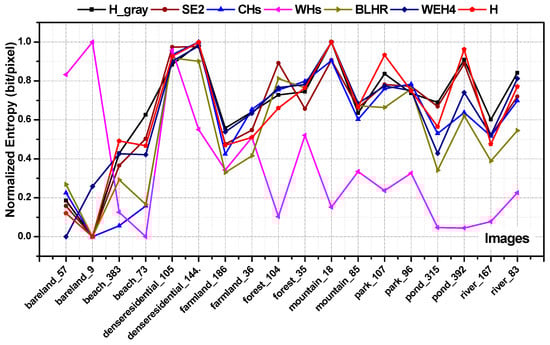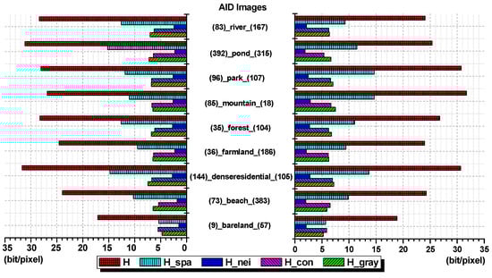 - Experiment 1: A few images are randomly selected from the AID [67] image dataset to assess consistency trends between information content and scene complexity. The AID dataset includes 30 different aviation scenes and 10,000 samples of image size 600 × 600 × 3;