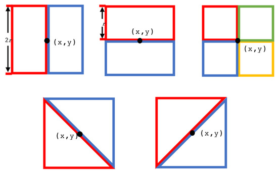 By applying a mean filter to the target pixel in each side window, we can obtain 12 outputs, denoted as , . During calculation, overlapping sub windows can be used to reduce repeated calculation.