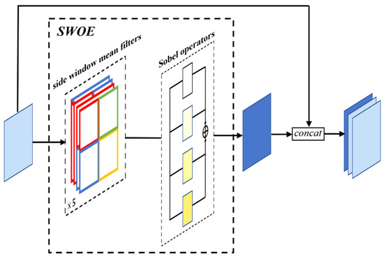 One part is the SAR ship outline enhancement preprocessing method shown in the red dashed box in Figure 1 corresponding to contribution 1 described in Chapter 1. The outline enhancement preprocessing method based on side window mean filtering (SWOE) to smooth the speckle noise and extract the SAR ship contour for SAR ship feature enhancement preprocessing. The side window mean filtering is a side-window filtering that uses a mean filtering kernel. Different from the traditional filtering that places the pixels to be processed at the center of the window, the side-window filtering places the pixels to be processed at the edge or diagonal point of the window, which improves the ability to preserve the outline [17], so that the mean filtering kernel can well preserve the outline feature of the ship when smoothing the speckle noise.