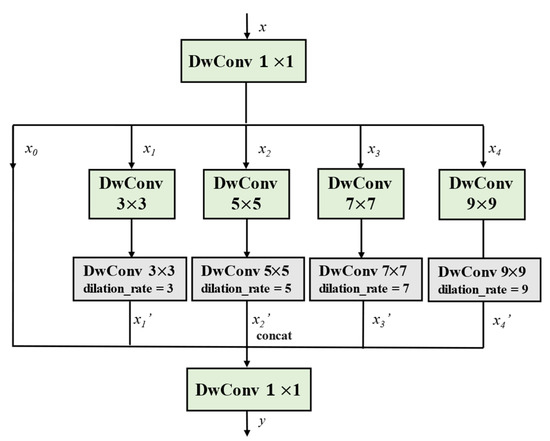 LSDP first uses depth-wise separable convolution to compress the channel, and then uses depth-wise separable convolutions of different sizes and dilated convolutions with different dilation rates constructed from them to form multiple parallel branches, with dilation rates of 3, 5, 7 and 9 respectively. In addition, there is another branch that is not processed. Finally, the outputs of these parallel branches are spliced together to form a feature map with multi-scale feature information. The process is summarized as follows: