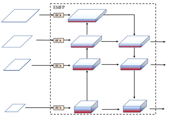 YOLOX uses three feature maps of the backbone network as input to the neck section. Considering that the proportion of space occupied by ships in the SAR image is very small and there are many small ship targets, we add a shallow feature in the neck part to fuse the features of the context semantic information of the four feature maps of , , and , so as to enhance the network′s ability to detect small targets. In addition, since the features of different channels in each feature layer contribute to the network to extract important information differently, in order to enhance the feature channels that make important contributions, we add an ultra-light channel attention module ECA [24] to the input part of neck, which is an efficient channel attention mechanism using a local cross-channel interaction strategy without dimensionality reduction. The multi-scale feature pyramid based on channel attention enhancement (EMFP) constructed by us is shown in Figure 8.