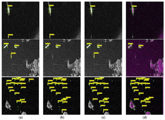 Visualization results of ablation experiments: (a) results of ablation experiment No. 1; (b) result of ablation experiment No.2; (c) result of ablation experiment No.3; and (d) result of ablation experiment No.4. The green rectangle is the real ship target label, and the yellow rectangle is the detected ship target.