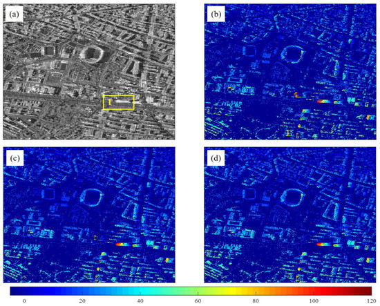 - After using BBN-PGA to compensate for PEs, the distribution of the estimated building heights in the study area is reasonable, and there are very few outliers. This proves that the proposed BBN-PGA method compensates well for PEs of the real data over a large area.Due to the high computational complexity of the TTNC and NC-PGA methods, the computation for a larger area takes a long time and occupies a large amount of memory. Therefore, in this experiment, a test area with a size of pixels (as shown in the red box in Figure 7b) is selected to compare the performance of the TTNC, NC-PGA and BBN-PGA methods. Figure 10 shows the estimated heights of the test area after PE compensation. The estimated heights of the three methods are similar, which can reflect that the PE compensation capabilities of the three methods are similar. To evaluate the performance of the three methods more quantitatively, we chose the high-rise building 1 (as shown in Figure 10a) for further comparative analysis.