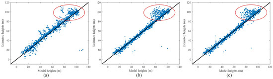 - After using PGA to compensate for PEs, it can be seen that the height estimation results in the central area of the study area have been improved, and the heights of buildings are reasonable. However, there are still many outliers (as shown in Figure 9b). Additionally, the estimated heights of the buildings near the edge area are poor (marked by the red ellipse in Figure 9b). This also proves that the PGA method is not suitable for large area processing.