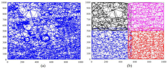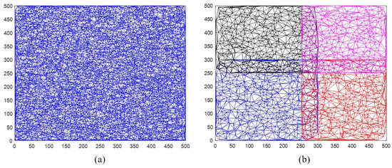 - In the simulated experiments, we set to select PSs. The NC-PGA method preserves 9793 PSs and arcs in DTN. While the BBN-PGA method retains PSs and arcs in the four sub-block DTNs, respectively. Figure 12 show the DTN of NC-PGA and BBN-PGA methods. The running time of the WLS step for NC-PGA and BBN-PGA is 68.69 s and 0.17 s, respectively. In the processing speed of the WLS step, the BBN-PGA method is about 405 times faster than the NC-PGA method, which is consistent with the above analysis. Table 3 shows the overall running time comparison of NC-PGA and BBN-PGA. The results show that BBN-PGA takes 5.92 s and NC-PGA takes 87.61 s. The BBN-PGA method is about 14 times faster than the NC-PGA method.