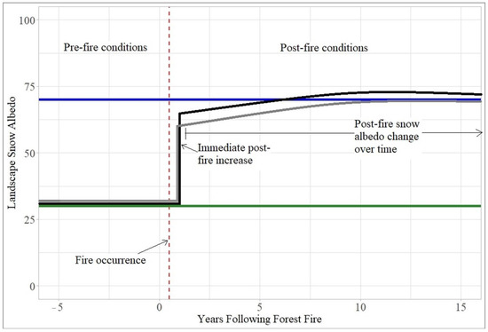 - Lyons, E.A.; Jin, Y.; Randerson, J.T. Changes in Surface Albedo after Fire in Boreal Forest Ecosystems of Interior Alaska Assessed Using MODIS Satellite Observations. J. Geophys. Res. Biogeosci. 2008, 113, G02012. [Google Scholar] [CrossRef] [Green Version]