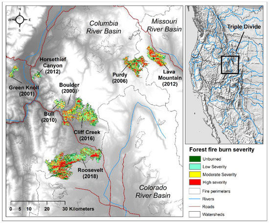 - Kemp, K.B.; Higuera, P.E.; Morgan, P.; Abatzoglou, J.T. Climate Will Increasingly Determine Post-Fire Tree Regeneration Success in Low-Elevation Forests, Northern Rockies, USA. Ecosphere 2019, 10, e02568. [Google Scholar] [CrossRef]