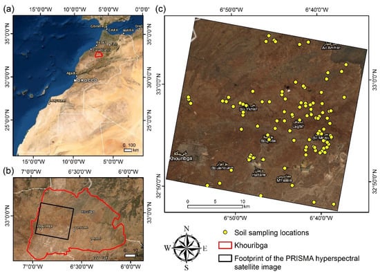 Location of the study area (a) within Morocco, (b) Khouribga province, and (c) GPS locations of soil sampling (yellow points) over the PRISMA hyperspectral image (RGB bands B34: 641.33 nm, B23: 546.48 nm, and B11: 456.37 nm).