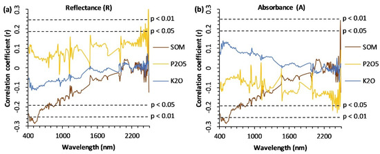 Correlation coefficients (r) between two PRISMA spectral formats and the soil nutrient contents. (a) reflectance (R), and (b) absorbance (A).
