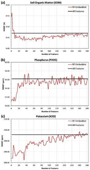 RMSEP values versus the number of features ranked by RF-embedded technique for the soil nutrient models: (a) soil organic matter (SOM), (b) available soil phosphorus (P2O5), and (c) available soil potassium (K2O). The horizontal line represents the model, including all features used in the prediction.