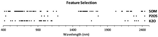 Figure 6 presents the wavelengths of the important bands derived from the best feature selection method (i.e., RF-embedded). As indicated in the preceding paragraph, these wavebands had the greatest influence on the predictive performance of the SOM, available soil P2O5, and K2O content. The VNIR (400–1100 nm) and SWIR (1481–1756 nm and 2103–2435 nm) wavelengths were found to be important in predicting SOM (Figure 6). The selected wavelengths for the P2O5 were 434, 951, 988, 1038, 1185, 1765, 2276, 2313, and 2435 nm. For the K2O, the selected wavelengths focus on band information from the VNIR (Figure 6).