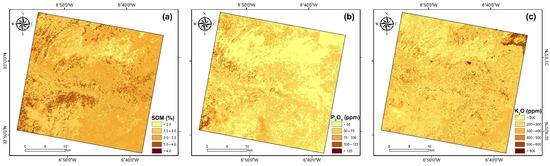 In the first stage, the best models based on PRISMA spectra (described in Section 3.4.3) were applied to all bare soil pixels included in the PRISMA image to produce the soil nutrient maps within the Khouribga area at 30 m of spatial resolution. In the second stage, the OK approach was used to interpolate all values retrieved from each soil nutrient map in order to estimate new values within all pixels of the PRISMA image. The exponential models were selected based on the minimal nugget effect, RMSE, and ASE values of cross-validation, after evaluating eleven function models during semi-variogram modeling using ArcGIS software. Table 7 shows the semi-variogram parameters of the RF-OK models for the soil nutrients. The nugget effect was used to characterize the spatial variability and dependency of the soil nutrient contents. If it was less than 25%, the variable was regarded as extremely spatially dependent; if it was between 25 and 75%, the variable was considered as moderately spatially dependent; and if it was more than 75%, the variable was considered as weakly spatially dependent [79]. In this study, the nugget effect of the residuals estimated from the RF-OK models exhibited high spatial dependence for the SOM (0.00%) and soil K2O (19.04%) and moderate spatial dependence for the soil P2O5 (42.94%) (Table 7). Moreover, based on the independent validation set, the RF-OK residuals demonstrated higher goodness-of-fit statistics values for the soil nutrients compared to only RF residuals, with the highest values for SOM (0.69), soil P2O5 (0.44), and K2O (0.51), respectively (Table 8).