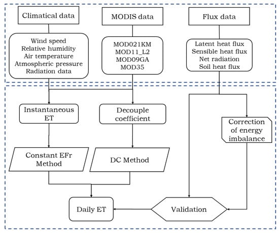 Flowchart of daily ET estimation and validation procedures through the DC method and the constant EFr method.