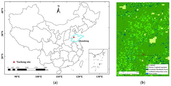 Location map of the Yucheng experimental site (a) and land cover classification near the Yucheng site in 2009 from Global Land Cover Map in Google Earth Engine (b) (Yuchen site was indicated by the filled red triangle and Shandong province was labeled as light blue).