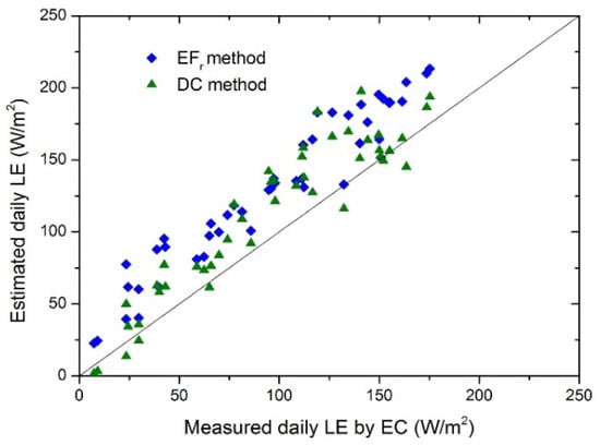 Therefore, both daily ET datasets estimated using the DC and constant Efr methods showed large deviations when compared with the EC measurements without correction of energy imbalance. To some extent, the overestimation of daily ET was partly assumed to come from the energy imbalance of the measured surface energy components on a diurnal day. Based on this assumption, it was expected that the estimated daily ET would result in better agreement with the EC measurements after correcting for the energy imbalance.