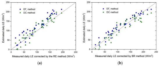 Validations of daily ET estimations calculated by the DC method and temporal upscaled by the constant EFr method against with corrected EC flux measurements by (a) the RE scheme and (b) the BR scheme.