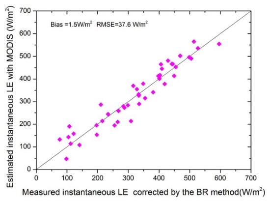 Validation of instantaneous ET estimations based on MODIS data, with the ET measurements corrected by the BR scheme.