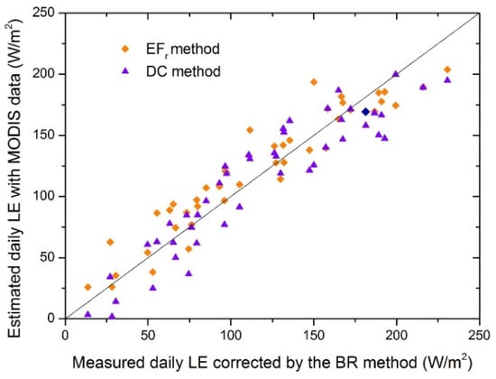 When the energy imbalance of daily ET measurements was corrected by the BR scheme, it was demonstrated that (i) daily ETs calculated through the DC method and upscaled with the constant EFr method both agreed best with the corrected ET measurements, with the lowest RMSEs of 18.2 and 16.2 W/m2, respectively; (ii) the DC method underestimated daily ET with a negative MBE (−4.7 W/m2), while the EFr method still had minimal overestimation of daily ET with positive MBE (10.5 W/m2); (iii) the similar value between the MBE and MAD (10.5 and 13.7 W/m2, respectively) of the constant EFr method further proved the overestimation on most selected days; and (iv) the constant EFr method had a larger R2 (0.940) than that of the DC method (0.890).