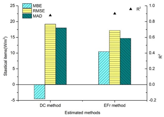 From the figure, it is obvious that both the DC and constant Efr methods generated overestimations of daily ET compared with the ET measurements, and the overestimation from the constant Efr method was greater. From the table, it can be seen that: (i) both the DC method and the constant Efr method resulted in overestimations of daily ET (positive MBE); (ii) the DC method performed better and generated more consistent ET estimations in terms of the original EC measurements, in which the MBE was 17.9 W/m2, the MAD was 20.9 W/m2, and the RMSE was 25.6 W/m2, respectively; (iii) the constant Efr method had larger estimation deviations, with an MBE of 32.8 W/m2, an MAD of 32.8 W/m2, and an RMSE of 35.7 W/m2; (iv) the constant Efr method had greater overestimation (with a higher averaged MBE) and daily Ets were overestimated on all the selected clear days (MAD = MBE), whereas some underestimations related to the DC method occurred on part of selected days (MAD > MBE); and (v) the constant Efr method had a larger R2 (0.926) than that of the DC method (0.879).