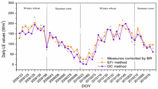 For better understanding the performances of these two estimation methods in daily ET calculation, Figure 9 shows the temporal variations in daily ET values calculated directly by the DC method and temporal upscaled by the EFr method against with ET measurements corrected by the BR scheme, during different winter wheat and summer corn growth stages. Overall, the temporal variations in daily ET from two methods have similar trends to that from ET measurements, and these variations vary considerably over the course of the season due to seasonally different radiations, atmospheric conditions, and growth stages of winter wheat and summer corn. Specifically, at winter wheat growth stage, daily ET estimations increased from a low value at the beginning to a high one in the summer of the next year and then decreased when the winter wheat was harvested; at the summer corn growth stage which was relatively shorter, daily ET also increased to a high value quickly and then decreased. The differences in daily ET variations may result from the different vegetation types which, in turn, lead to variations in the photosynthesis, water use, and fraction of incoming solar radiation and the interaction between air and surfaces.