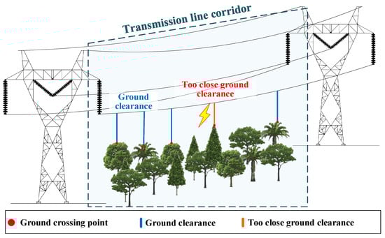 As can be seen in Figure 1, ground clearance refers to the vertical distance between transmission line conductors and the corresponding objects on the ground, which is a key indicator to judge the security of the transmission line corridor. In addition, the safety of ground clearance should be judged by the voltage of the transmission line and the category of the ground object. Taking the 220 kV transmission line as an example, according to the relevant regulations in China, the minimum safe vertical clearance between power lines and buildings is 6 m, while that between power lines and trees is 3.5 m. Therefore, effective transmission line corridor detection requires three steps. Firstly, accurate spatial location of power lines and ground objects should be achieved. Secondly, the type of ground objects under the power lines should be determined accurately. Finally, the ground clearances between power lines and corresponding ground objects are measured to diagnose the safety of the transmission line corridor. It can be seen that inspection of the transmission line corridor is a very important but challenging job.