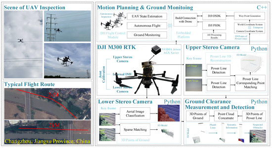 - A novel automatic inspection system for the transmission line corridor is developed. In this system, a dual-view stereovision module and an embedded NVIDIA platform are mounted on the UAV to perceive the surrounding environment. The dual-view stereovision module consists of two binocular cameras. One binocular camera is used to acquire the images of power lines and provide information for automatic flight. Another binocular camera is used to identify and locate the ground objects under power lines. The embedded NVIDIA platform is used to process information acquired by the dual-view stereovision module and achieve power line detection and reconstruction, aerial image classification, and ground clearance measurement. Different images from two views can be acquired and processed synchronously by the collaboration of the embedded NVIDIA platform and the dual-view stereovision module. Then, automatic inspection and real-time ground clearance measurement can be achieved simultaneously.