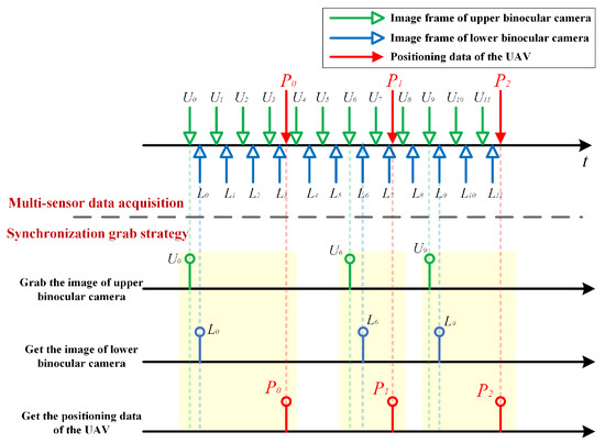 In order to synchronize the upper and downward cameras with the IMU, we performed two steps. The first step is to synchronize the local time of the embedded NVIDIA platform to the system times of the DJI UAV by utilizing the OSDK and PSDK. The UAV will send positioning data packets at a frequency of 1 Hz. The binocular image acquisition frequencies of the upper and downward cameras are both 5 Hz. It is obvious that the data acquisition frequencies of the UAV positioning module and binocular cameras are different. Therefore, in the second step, we designed a multisensor synchronous capture strategy to achieve the data synchronization. As shown in the Figure 3, the images obtained by the upper binocular camera are used as trigger information to grab other data within the same time interval. When we capture an image from the upper binocular camera, we will capture the first image from the lower binocular image and the first positioning data from the UAV to form a set of synchronous data. In the figure, the area with a light-yellow background represents a set of synchronized data. For example, is a set of synchronized data, so are and .