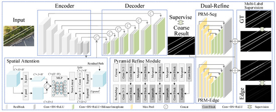 Since power lines may possess different numbers, angles, and thicknesses in aerial images, it is difficult to extract enough semantic cues from aerial images to achieve accurate power line detection. By integrating the idea of multitask learning, we propose an edge-assisted dual-refinement power line detection network. As shown in Figure 4, the proposed network consists of two important modules. The U-Net-like encoder–decoder module is adopted to predict the coarse detection results. Two layers are added behind the ResNet 18 backbone to detect more high-level semantic cues. Then, high-level features are further enhanced with the proposed spatial attention module. The framework of decoder is nearly symmetrical to the encoder except for the shortcut with lower layers.