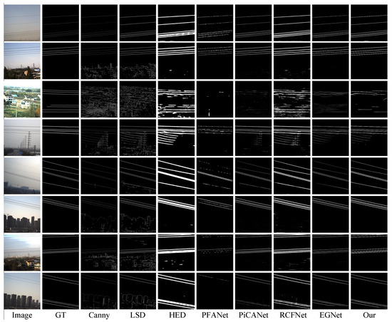 We compare the proposed power line detection method with four edge detection methods including Canny, LSD [30], HED [31], and RCF [32]. Saliency detection could detect and segment salient objects into single-channel grayscale images, which are consistent with power line detection results. Therefore, three state-of-the-art saliency detection methods including PiCANet [33], EGNet [34], and PFANet [35] are also selected for comparison. Note that the annotations of all datasets are converted into the binary form, and all these deep-learning-based methods are produced by training on the four datasets, respectively. The power line detection task could be considered as a kind of binary segmentation task such as salient object detection and edge detection. We adopt three commonly used metrics to quantitatively evaluate the proposed method including Max F-measure, MAE, and S-measure, which could evaluate the detection results at the pixel and structure levels.