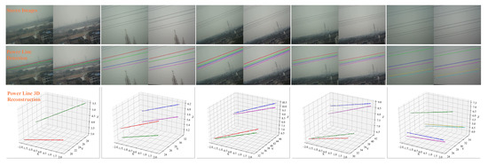 The texture feature of power lines is too similar to distinguish, which makes it hard for stereo matching algorithms to define matching cost and search for correct matching point pairs. Thus, it is difficult to reconstruct the power lines. To solve the above problem, we firstly detect the power lines in the rectified binocular images. The power line detection results are refined and thinned to single-pixel width. For a certain point on the power line, its Y coordinate values in the binocular images are the same. Based on this epipolar constraint, all point pairs with the same Y values on power lines are matched. For the matching points of the first power line in stereo images, and , the disparity of the matching points could be calculated as . Then, the first power line could be converted into the 3D coordinate as , where denotes the 3D power line points and P denotes the 3D point sets of power lines. N represents the total number of 3D power line points.